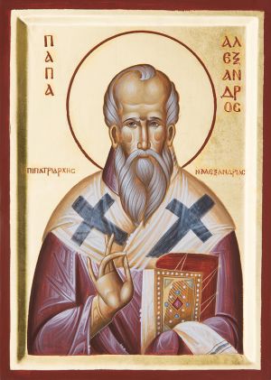 Alexander wurde um das Jahr 250 geboren, im Jahr 313 zum Patriarchen von Alexandria gewählt und begann um das Jahr 318 den Kampf gegen die Irrlehre des Arius, die die Wesensgleichheit von Gott Vater und Gott Sohn leugnete. Er verbannte ihn aus der Stadt und beantwortete dessen Propaganda mit zahlreichen Briefen. Mit seinem Sekretär und späteren Nachfolger Athanasius war der hl. Alexander im Jahr 325 die führende Persönlichkeit auf dem ersten Ökumenischen Konzil von Nicäa, auf dem sich das allgemeine »Nicänische Glaubensbekenntnis« durchsetzte, mit dem der Arianismus als Irrlehre verurteilt und die Lehre von der Dreieinigkeit der göttlichen Personen bestätigt wurde. Er entschlief in Frieden um das Jahr 328.