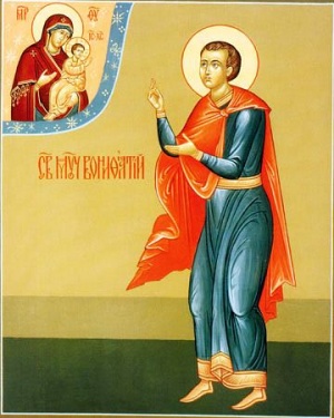 Du bist inbrünstig den Märtyrern gefolgt und hast Christus vor den Ungläubigen bekannt, o Bonifatius. Du hast deinen Leib der bescheidenen Aglaia als unvergänglichen Schatz geschenkt: Heilung und Barmherzigkeit fließen von ihm für die Welt.