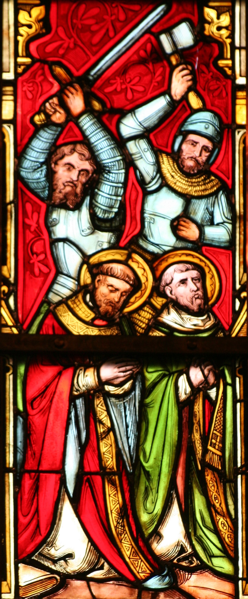 Glasfenster in der Kirche von Druten (Niederlande) mit dem Martyrium der beiden Ewalde.