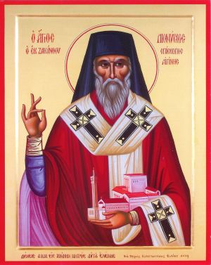 Der heilige Dionysius stammte von der Insel Zakynthos, wo er 1547 als Sohn frommer Eltern zur Welt kam. Bereits in jungen Jahren wurde er Mönch auf den benachbarten Strophaden-Inseln. Später war er Bischof von Ägina. 1579 verzichtete er auf sein Bischofsamt und kehrte in seine Heimat zurück, wo er im Kloster der Gottesmutter Anaphonitria lebte und im Jahr 1622 zum Herrn entschlief. Dionysius wurde seinem Wunsch gemäß im Kloster der Strophaden bestattet, welches später von türkischen Piraten zerstört wurde. Im Jahr 1703 wurde er heiliggesprochen und 1717 kamen seine Reliquien in die Kathedrale von Zakynthos, seither wird als Schutzpatron der Insel verehrt.