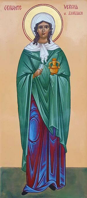 Du bist der Liebe deiner Jugend gefolgt, und hast die Liebe deines Herzens gefunden. Denn dein Leben hast du der Liebe Gottes geweiht in Liebe deinen Nächsten gedient. So bist du zum Vorbild der Liebe geworden, gerechte Jungfrau Verena, bitte deinen Herrn, der die Menschen liebt, dass Er auch unsere Seelen errette!