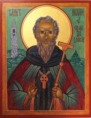 Der hl. Kevin stammte aus königlichem Geschlecht und wurde um 498 geboren, pilgerte nach Rom und gründete im 6. Jahrhundert das Kloster Glendalough bei Wicklow südlich von Dublin, das sich bald zu einem Mittelpunkt des religiösen Lebens entwickelte. Kevin entschlief um 618 im Alter von 120 Jahren. Er wird bis heute als großer Wundertäter verehrt und zudem als Patron der irischen Hauptstadt Dublin.