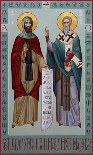 Die Brüder wurden in der griechischen Stadt Thessaloniki geboren und beherrschten von Kindheit an den örtlichen slawischen Dialekt, den ein beachtlicher Teil der Bevölkerung der Stadt und ihrer Umgebung sprach. Der jüngere Bruder Konstantin (Kyrill war sein Mönchsname) erhielt eine glänzende Ausbildung in der Hofschule von Konstantinopel, war einige Zeit Bibliothekar in der Bibliothek des Patriarchen, zog aber die Hingabe an Gott dem hohen Dienst bei Hof vor. Er ging heimlich in ein Kloster am Marmarameer und befasste sich mit dem Studium des Schrifttums. Aber bald wurde sein Aufenthaltsort entdeckt, und Konstantin musste in die Hauptstadt zurückkehren, wo ihn die Stelle eines Lehrers der Philosophie an der Universität von Konstantinopel erwartete. Schon in jungen Jahren wurde Konstantin als herausragender Philosoph und Polemiker bekannt. Er siegte im Gelehrtenstreit mit dem ehemaligen Patriarchen Johannes, einem Anhänger des Ikonoklasmus, nahm an Missionsreisen zu den Sarazenen und Chazaren teil, wo er die Dogmen der christlichen Glaubenslehre glänzend verteidigte. Als der großmährische Fürst Rostislav im Jahre 862 mit der Bitte an den byzantinischen Kaiser Michael III. herantrat, ihm eine geistliche Person für die Predigt des Wortes Gottes unter den Slawen in ihrer Muttersprache zu senden, fiel die Wahl auf Konstantin und seinen älteren Bruder Methodius, der zu jener Zeit Mönch in einem Kloster auf dem Berg Olymp lebte. Kyrill und Methodius führten als erstes die slawische Sprache ein, wozu Kyrill sogar eigene, der slawischen Sprache angepasste Schriftzeichen schuf »Glagolitische Sprache«. Er gilt somit als Begründer der slawischen Literatur. Auch übersetzte er die Heilige Schrift in die slawische Sprache.