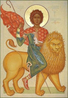 Mit dem Stabe, den dir Gott geschenkt hat, weide, o Heiliger, auf lebenbringenden Auen dein Volk. Alle unsichtbaren und lichtscheuen Raubtiere aber unterwirf denen, die dich besingen. Allen Gefährdeten bist du, o heiliger Mámas, ein geneigter Beschützer.