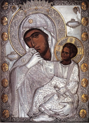 Der Überlieferung nach geschah es eines Tages, noch in byzantinischer Zeit, dass der Abt, als er dem Pförtner die Schlüssel übergeben wollte, von der Ikone her folgende Worte hörte: “Öffne heute die Tore des Klosters nicht, geh auf die Mauern des Klosters und vertreibe die Piraten”. Die Stimme wiederholte diese Worte ein zweites Mal. Als er sich umwandte und auf die Ikone blickte, sah er, wie das Heilige Kind seine Hand auf den Mund der Mutter legte, und hörte es sagen: “Nein, Mutter, lass sie bestraft werden, wie sie es verdienen”. Die Selige Jungfrau jedoch nahm die Hand von Christus, bewegte ihren Kopf leicht und wiederholte ihre Worte. Die Mönche eilten auf die Mauern, erblickten die Piraten, die inzwischen tatsächlich das Kloster umzingelt hatten und darauf warteten, dass die Tore geöffnet würden, damit sie eindringen und das Kloster plündern könnten. Das wundervolle Eingreifen Unserer Lieben Frau hatte das Kloster gerettet, die Ikone aber hat seither die Spuren dieser Bewegungen ihrer Figuren bewahrt. Von Stund an stellten die Mönche ein ewiges Licht vor der Ikone auf, die Freitagsliturgie wird zu ihren Ehren vollzogen, jeden Tag eine besondere Litanei gebetet. Es war eine Zeitlang sogar der Brauch, dass die Mönche in dieser Kapelle ihre Tonsuren bekamen.