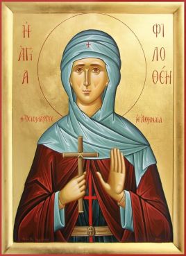 Lasst uns den Stolz der Stadt der Athener ehren, Philothea, die gerechte Märtyrerin. Lasst uns ihre heiligen Reliquien umarmen und küssen. Sie lebte in Heiligkeit und tauschte dieses vergängliche Leben gegen das Ewige durch ihren Kampf und ihr Martyrium ein. Sie bittet den Erlöser, uns seine große Gnade zu gewähren.