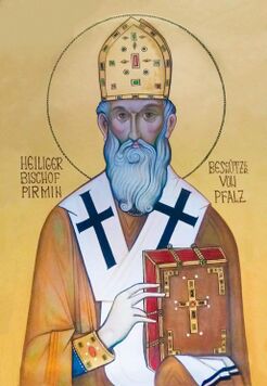 Nach der Überlieferung irischer Abstammung, wurde er Mönch und Glaubensbote. Wohl um das Jahr 720 wurde er in Frankreich zum Bischof geweiht und im alemannischen Raum am Oberrhein wirkte. Er gründete im Jahre 724 auf der Bodensee-Insel Reichenau ein nachmals berühmtes Kloster, dem er als Abtbischof vorstand. Zur Klostergründung erhielt als Schenkung die Insel und die Orte Markelfingen, Allensbach, Kaltbrunn, Wollmatingen, Allmansdorf und Ermatingen. Die Abgaben dieser Orte sollten dem neuen Kloster gehören. Die Insel selbst war damals unbewohnt und verwildert. Die Legende erzählt, dass als der Heilige die Insel betrat, Schlangen, Kröten und Gewürm fluchtartig die Insel, auf der sie hausten, verließen und sich in den See stürzten. Drei Tage und drei Nächte soll die Flucht gedauert haben. Danach habe Pirmin mit seinen vierzig Männern die Insel gerodet und urbar gemacht. Für die Mönche unter ihrem Abtbischof Pirmin wurde am Nordufer der Insel ein aus Holz erbautes Kloster mit Kirche errichtet.