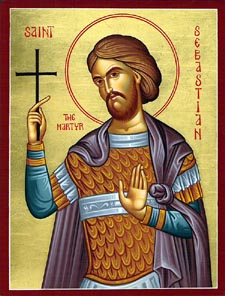 Der Hl. Märtyrer Sebastian wurde in Narbonne in Gallien geboren und lebte in Mailand, woher seine Familie ursprünglich stammte. Er war christlich erzogen worden und zeichnete sich besonders durch seine Liebe zu den Bekennern und Märtyrern Christi aus. Unter Kaiser Carinus wurde er Soldat. Als er als solcher nach Rom gelangte, hörte er von zwei noch jungen Christen namens Markus und Marcellinus, die wegen ihres Glaubens an Christus zum Tode verurteilt worden waren; und unter dem Eindruck der bitteren Tränen ihrer Eltern und Verwandten, die nahe daran waren, den Mut zu verlieren, eilte Sebastien zu diesen und ermutigte sie durch glühende Worte zum Festhalten im Glauben. Hierdurch wurden nicht nur die beiden Brüder Markus und Marcellinus mit neuer Kraft erfüllt, sondern auch die Umstehenden von solcher Rührung erfüllt, dass eine Frau namens Soe, die Gattin des Nikostratus, in dessen Haus die Bekenner bewacht wurden, dem Hl. Sebastian zu Füßen fiel und um seinen Segen bat. Sie war seit sechs Jahren stumm und hoffte durch den Segen des Heiligen, ihre Sprache wiederzuerlangen. Nachdem Sebastian das Kreuzeszeichen über ihrer Zunge gemacht hatte, konnte Soe sogleich wieder vernehmlich sprechen. Sie bekannte sich daraufhin zu Christus und pries Ihn als ihrem Herrn und Gott. Hierdurch bekehrte sich auch ihr Mann zu Christus, die Verwandten von Markus und Marcellinus und noch viele andere, die von dem an Soe geschehenen Wunder erfuhren. Nikostratus nahm daraufhin alle in sein Haus auf, wo sie im christlichen Glauben unterrichtet wurden, und ein Priester namens Polykarp alle taufte. Bei der Taufe wurde Tranquillinus, der Vater von Markus und Marcellinus, von der Gicht geheilt. Dies erfuhr der römische Statthalter Chromacius, der ebenfalls schwer gichtleidend war. Dieser fasste daraufhin ebenfalls den Entschluss, Christ zu werden. Nachdem Sebastian ihn im christlichen Glauben unterwiesen und getauft hatte, wurde auch er von der Gicht geheilt. Aus Dankbarkeit dafür ließ er alle neubekehrten Gefangenen frei, schenkte auch seinen Sklaven die Freiheit und legte sein Amt nieder. Als Kaiser Carinus im Jahre 283 starb, wurde Diokletian sein Nachfolger, der wiederum Maximinian zu seinem Mitkaiser machte. Als Diokletian von dem Mut und der Tapferkeit des Hl. Sebastian hörte, gewann er ihn so lieb, dass er ihn in den Rang eines Hauptmanns erhob. Nach der Abreise Kaiser Diokletians nach Nikomedia blieb Sebastian in Rom zurück und genoss die besondere Achtung durch Kaiser Maximinian. Um diese Zeit erhielt der ehemalige Statthalter Chromacius die kaiserliche Erlaubnis, sich aufs Land zurückzuziehen, wo er den Rest seiner Tage mit mehreren Neubekehrten verbringen wollte. Da sie aber noch unvollkommen im christlichen Glauben unterrichtet waren, bemühten sie sich darum, dass ihnen entweder Sebastian oder der Priester Polykarp als Lehrer dienten. Aus Sehnsucht nach dem Bekennertod für Christus wollten Sebastian und Vater Polykarp Rom aber nicht verlassen. Deshalb wandte man sich an Cajus, den damaligen Bischof von Rom, und bat ihn um eine Entscheidung. Bischof Cajus war dafür, dass Sebastian in Rom blieb, weil er einen hohen Rang in der Armee bekleidete und so leichter für verfolgte Brüder eintreten konnte.