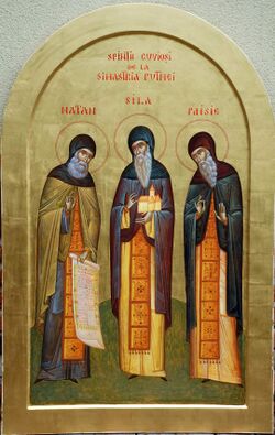Der hl. Silas wurde im Jahr 1697 in der Region Botosani geboren und kam im Jahr 1714 im Alter von 17 Jahren ins Kloster Sihăstria Putnei, von 1753 bis 1781 diente er als Abt und beaufsichtigte die Errichtung der Kirche der Verkündigung. Am 23. April 1783 entschlief er zum Herrn. Der hl. Nathan wurde 1717 geboren und lebte zuerst im Kloster Putna, wo er zum Diakon, dann zum Priester geweiht wurde. Er wünschte sich mehr Gebet und Frieden und zog sich nach Sihăstria Putnei zurück und diente von 1781 bis 1784 als Abt, als viele Klöster der Region aufgehoben wurden. Am 26. Dezember 1784 entschlief er zum Herrn. Der hl. Paisios wurde 1701 geboren, er war ein geistiges Kind des hl. Nathan und hat als eifriger Verteidiger des orthodoxen Glaubens und als Seelenführer gewirkt, er entschlief am 16. Dezember 1784. Im Jahr 1990 wurden ihre Reliquien aufgefunden und im Jahr 2016 wurde ihre Verherrlichung vollzogen.