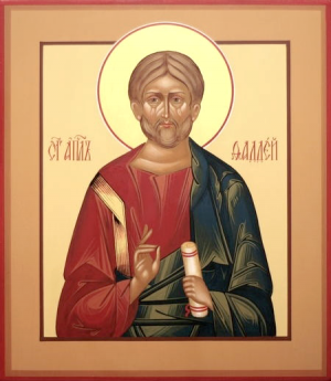 Der Apostel Thaddäus war einer der Siebzig, sah und hörte zuerst Johannes den Täufer und empfing die Taufe von ihm, danach sah er den Herrn Jesus und folgte Ihm. Der Herr zählte ihn zu den siebzig Aposteln, die Er zu zweit vorausschickte. Nach seiner Auferstehung und Himmelfahrt sandte ihn der Herr nach Edessa, dem Versprechen gemäß, das Er Fürst Abgar gegeben hatte, als Er ihm das Tuch mit seinem Abbild geschickt hatte. Indem Abgar das Tuch küsste, wurde er vom Aussatz geheilt, aber nicht vollständig. Ein wenig Aussatz blieb noch auf seinem Gesicht. Als er vor Abgar erschien, empfing ihn dieser mit großer Freude. Der Apostel Christi unterwies ihn im wahren Glauben und taufte ihn daraufhin. Als der getaufte Abgar aus dem Wasser kam, fiel der verbliebene Aussatz von ihm ab, und er wurde völlig geheilt. Fürst Abgar verherrlichte Gott und wollte nun, das auch sein Volk den wahren Gott erkennen und verherrlichen sollte. Der Fürst rief alle Einwohner von Edessa zusammen, damit sie vom hl. Apostel vom wahren Glauben erführen. Als die Menschen seine Worte hörten und ihren Fürsten auf wundersame Weise geheilt sahen, verwarfen die Menschen die Götzen, ihre unreine Lebensweise, nahmen den Glauben an Christus an und wurden getauft. So wurde die Stadt Edessa vom christlichen Glauben erleuchtet. Thaddäus verkündete das Evangelium in ganz Syrien und Phönizien und entschlief im Herrn in Beirut.