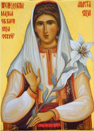 Du hast dich Christus, dem Herrn, als ein Gefäß der Demut erwiesen und dich Seinem Willen übergeben. Mit Freude eiltest du, das Werk Gottes zu tun, indem du dein heiliges Kind für den Dienst an Gott erzogst. Du beeiltest dich, dem Herrn zu dienen, indem du auf die Mutter Gottes vertrautest. Du hast dich der himmlischen Herrlichkeit würdig erwiesen und Gott bis zum Ende treu gedient. Freue dich, selige Anastasia, Mutter des Wundertäters von Ostrog.