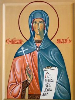 Die hl. Anastasia wurde laut Überlieferung nach dem Tod ihrer Mutter Nonne in einem Kloster bei Rom. Da sie sehr Viele durch ihre Predigt bekehrte, wurde sie unter Kaiser Decius (249 bis 251) gefangen genommen und nach Rom gebracht. Hier wurde die hl. Märtyrerin gefoltert und schließlich enthauptet. Dies geschah im 3. Jahrhundert. Überlieferungen berichten, dass sich Anastasias Grab in Konstantinopel - dem heutigen Istanbul - befand. Schon im 4. Jahrhundert wurde ihr Todestag ein Festtag im römischen Kirchenjahr: das war die Geburtsstunde des Festtages, der heute das Weihnachtsfest ist.