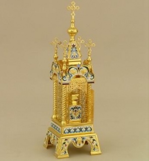 Auf dem Altartisch hat gewöhnlich auch der Tragbehälter für die Heiligen Gaben seinen Platz – ein kleiner Behälter in Form einer Kapelle mit einem Türchen und einem Kreuz an der Vorderseite. Im Inneren dieses Tragbehälters befinden sich ein Kästchen, das zur Aufbewahrung der Heiligen Gaben dient, ein kleiner Kelch, ein Löffelchen und manchmal auch ein kleines Gefäß für den Wein. Die Priester tragen die Heiligen Gaben in diesem Tragbehälter an einer über den Hals gelegten Schnur auf der Brust zur Krankenkommunion in die Häuser, deshalb haben diese Behälter an den Seiten oft auch Ösen. Es gibt auch speziell für die Tragbehälter genähte Säckchen.