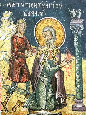 Der hl. Märtyrer Barlaam wurde in Antiochia geboren. Während der Christenverfolgung wurde Barlaam an den Opfertisch eines Götzen gezwungen. Nach verschiedenen Folterungen legte man ihm Weihrauch und brennende Kohlen in die Hände - in der Hoffnung, dass er die brennende Substanz nicht in Händen halten könne und sie auf den Opfertisch werfe müsse. Dies wäre dann als Opfer des hl. Barlaam an den Götzen und als Abwendung vom Christentum zu verstehen gewesen.