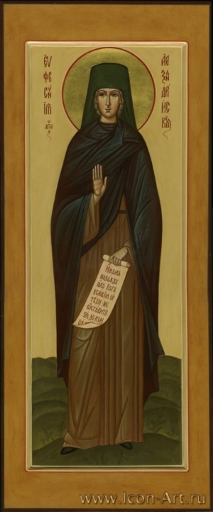 Die Heilige Nonne Euphrosyne stammte aus Alexandria und war die Tochter von reichen und vornehmen Eltern. Im 18. Lebensjahr verließ sie das elterliche Haus und, da ihr Vater keine Mönchsweihe für seine Tochter wünschte, trat sie in ein Männerkloster ein (da es kein Nonnenkloster in der Gegend gab) und stellte sich als Eunuch Smaragdos vor. Erst kurz vor ihrem Tod offenbarte die Heilige das Geheimnis ihrem Vater. Überzeugt von seiner Tochter, verbrachte der Vater die letzten zehn Jahre seines Lebens im selben Kloster, in der Zelle seiner Tochter. Nach mehreren Jahren asketischen Lebens starb Euphrosyne friedlich um die Mitte des 5. Jahrhunderts.