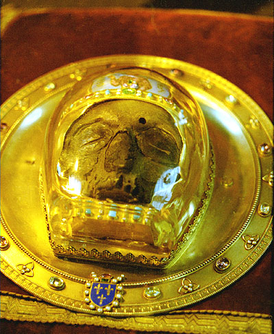 1204 beim Sturm Konstantinopels durch die Kreuzritter, wurde die Hauptstadt geplündert und verwüstet. Nach westlicher Überlieferung hat ein Kanoniker Wallon de Sarton aus Picquigny in den Ruinen eines der Paläste ein Etui gefunden in dem ein Silberteller war. Auf dem Teller war unter einer Glaskuppel die Reste eines Menschlichen Kopfes zu sehen und es fehlte lediglich der Unterkiefer. Über der linken Augenbraue war eine Spur von einem Schwertschlag zu erkennen. Auf dem Teller entzifferte der Kanoniker die griechische Inschrift, die ihm bestätigte, was er da in der Hand hielt und die Spur über der Braue stimmte mit dem Bericht des hl. Hieronymus überein, als dieser sagte, dass Herodiada im Wutanfall mit einem Säbel auf den Abgeschlagenen Kopf des Johannes gehauen habe.