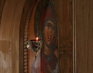 Im mittleren Teil der Kirche hängen vor fast allen Ikonen Öllampen, vor besonders verehrten Ikonen hängen sogar mehrere. Außerdem werden vor einigen Ikonen Kerzenständer für die Kerzen der Gläubigen aufgestellt. Ein großer Kerzenständer steht auch immer in der Mitte der Kirche neben dem Pult, auf dem die Festtagsikone liegt.