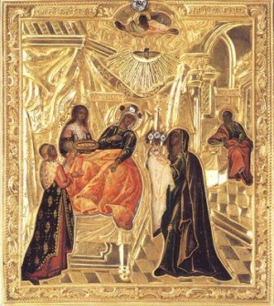 Die Eltern der Allheiligen Mutter Gottes waren die gerechten Joachim und Anna. Bis ins hohe Alter hinein waren sie kinderlos, aber eines Tages erschien ein Engel und verkündete Anna, dass sie eine Tochter gebären werde, die man dem Herrn weihen, d. h. im Alter von drei Jahren zur Erziehung in den Tempel geben solle. Das Kind wurde zur Freude der Eltern zur angegebenen Zeit geboren, und dieser Moment wird auf der Ikone “Mariä Geburt” dargestellt.