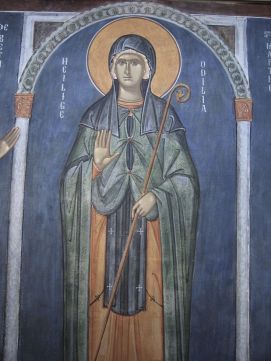 Odilia (Ottilia), geboren um das Jahr 660, war die Tochter des Herzogs Attich oder Adalrich, der im Elsass große Besitzungen hatte. Sie gründete die Klöster Hohenburg (später nach ihr Odilienberg genannt) und Niedermünster (am Fuß des Odilienberges). Sie entschlief um das Jahr 720 und wurde auf dem Odilienberg begraben. Ihre Verehrung ist vor allem in Südwestdeutschland und der Schweiz verbreitet. Sie wird gegen Augenleiden angerufen, weil sie nach der Legende blind geboren war und bei der Taufe das Augenlicht empfing.