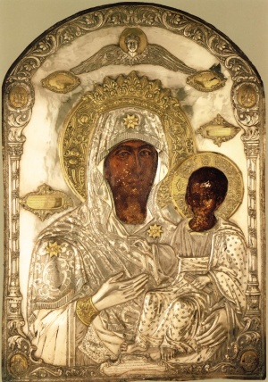 Die Ikone der Panaghia Antiphonitria ist ein Wandgemälde; sie befindet sich im Mesonyktikon des Katholikon des Klosters Vatopedi. Ihren Namen hat sie von der Stimme, die von ihr ausging (antiphonise bedeutet “sie antwortete”). Es wird überliefert, dass das Kloster einst von Placidia, der Tochter Theodosius’ des Großen, besucht wurde. Als sie sich dem Katholikon näherte, in der Absicht, es durch die kleine Seitentür zu betreten, hörte sie eine Stimme, die von der Ikone ausging: “Bleibe, wo du bist und tritt nicht näher. Wie kannst du, eine Frau, es wagen, an diesen Ort zu kommen?” Die Prinzessin, von Furcht ergriffen, bat die Mutter Gottes um Vergebung und verließ den Heiligen Berg unverzüglich. Zur Erinnerung an dieses Wunder ließ sie die Kapelle des Hl. Demetrius errichten.